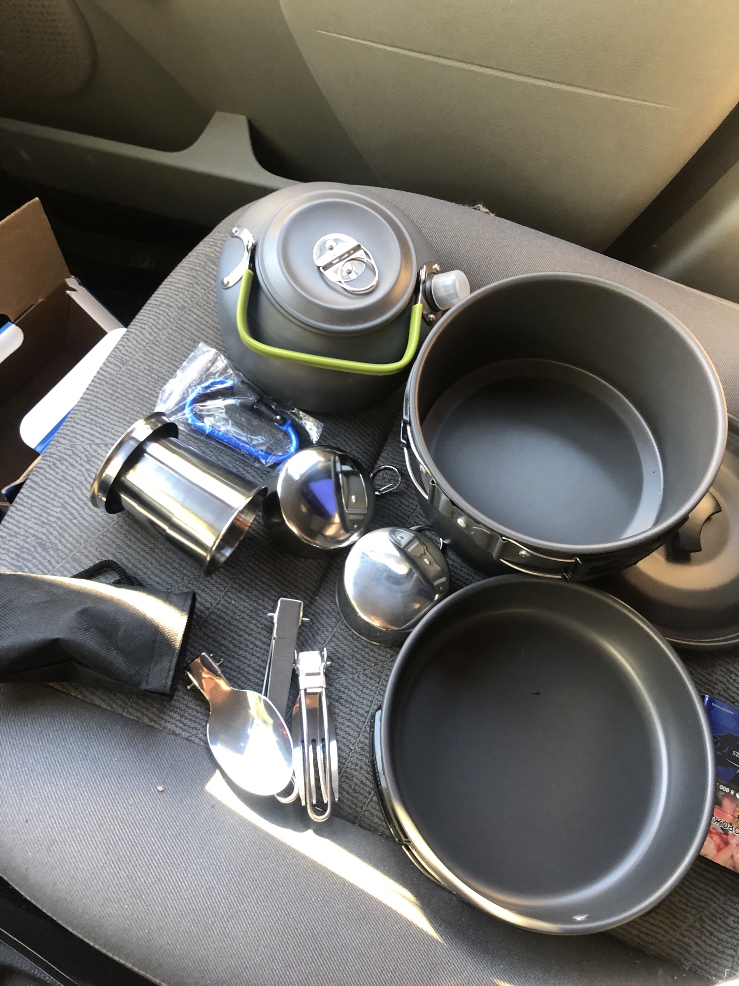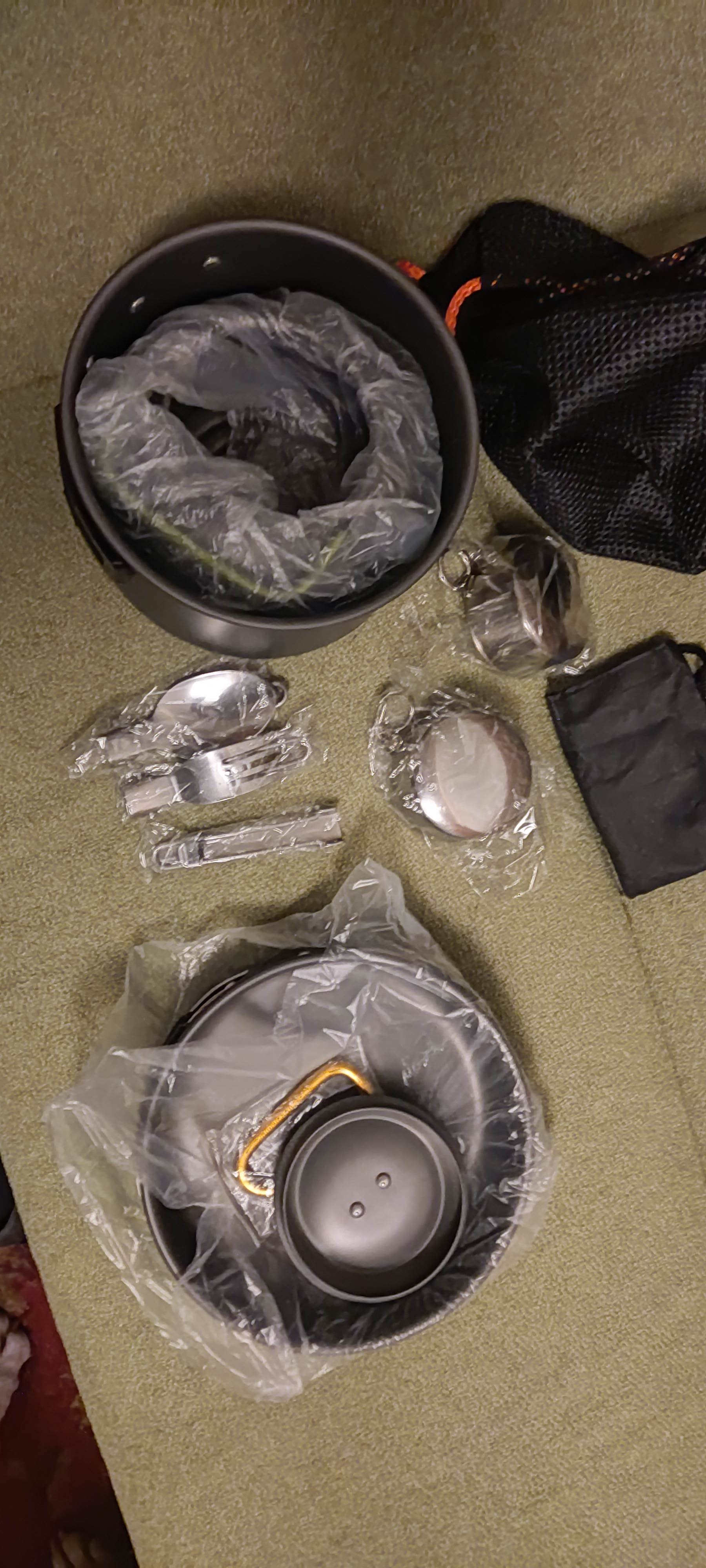 The set is normal. Spoon, fork, knife so-so and mugs too. And the dishes themselves are excellent, takes up little space. Kettle for two large mugs, I was surprised myself.