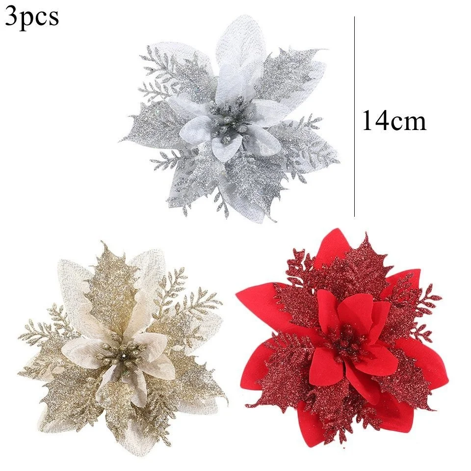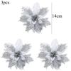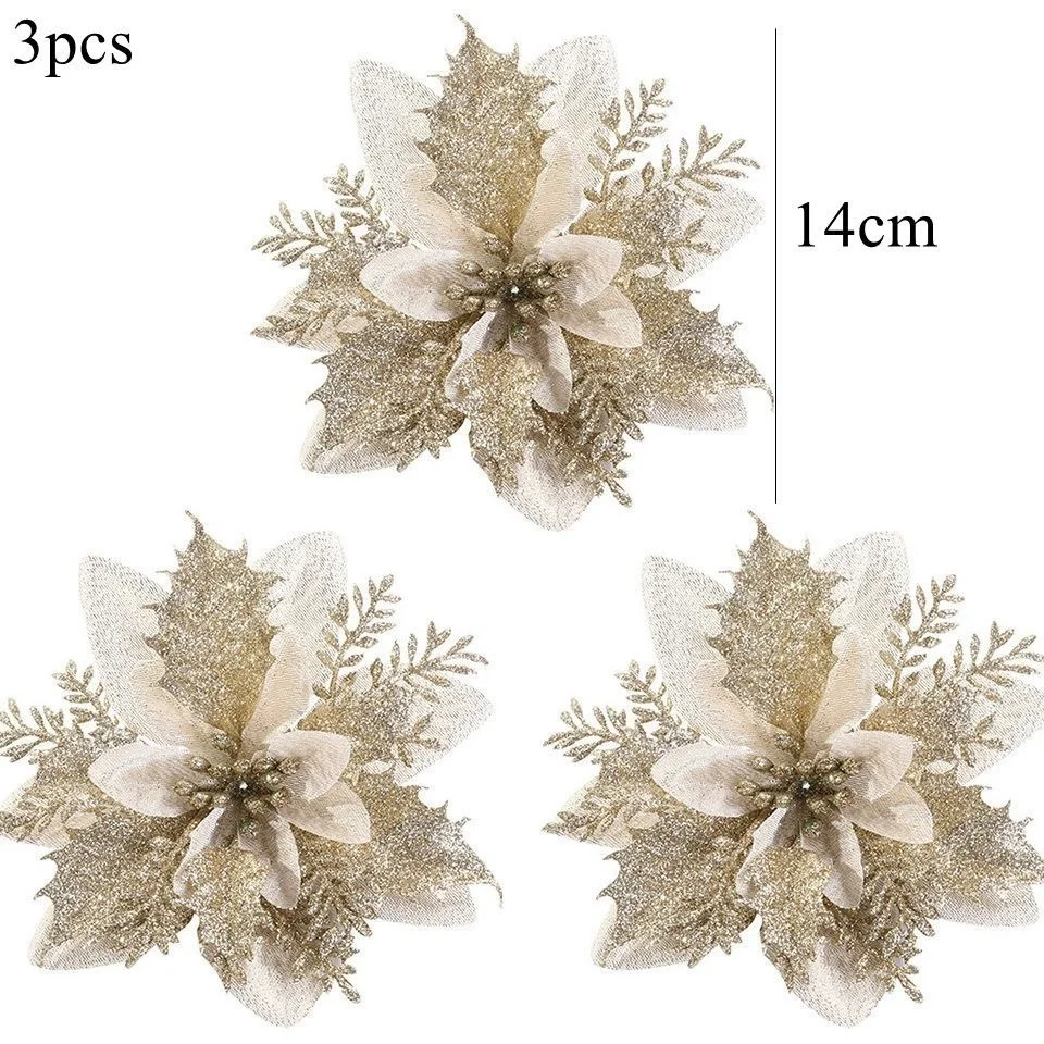 3PCS Christmas Flowers Red Gold Bling Flower Heads For Noel Home Tree Decorations Navidad Party Table Setting Decor Supplies