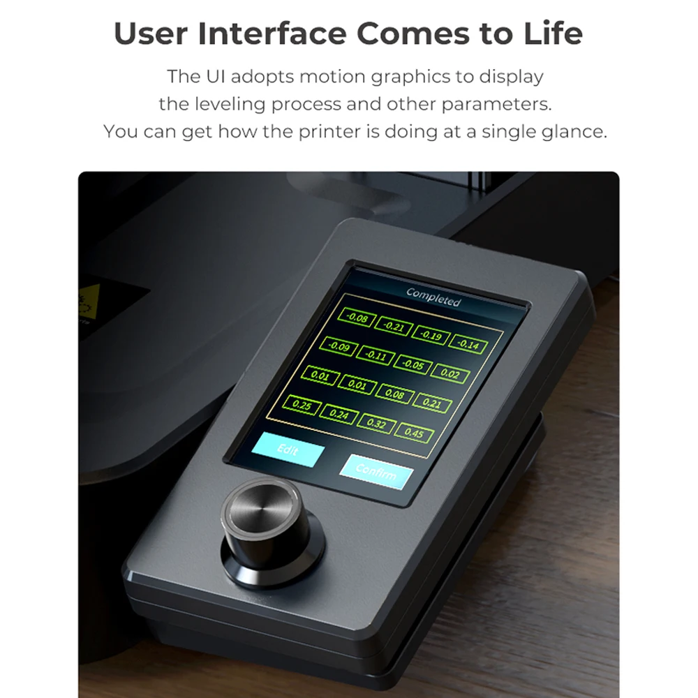 The Ul adopts motion graphics to display the leveling process and other parameters.You can get how the printer is doing at a single glance.
