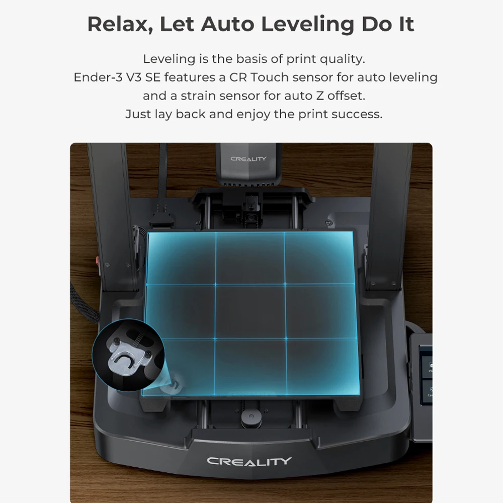 Leveling is the basis of print quality. Ender-3 V3 SE features a CR Touch sensor for auto leveling and a strain sensor for auto Z offset.Just lay back and enjoy the print success.