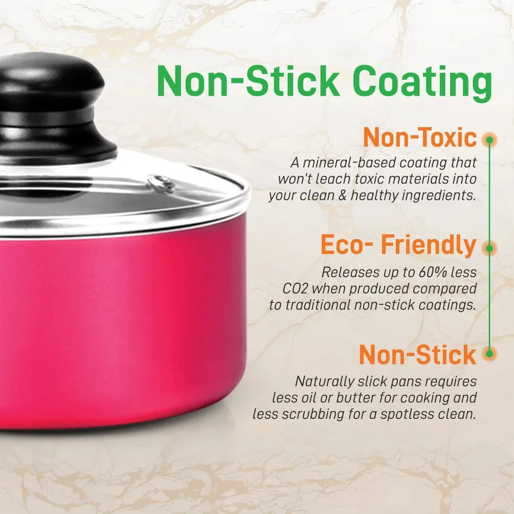 NutriChef NCCWCOR15 – Kitchenware Pots & Pans Set – Colorful Kitchen Cookware, Black Non-Stick Coating Inside, Heat Resistant Lacquer and Mixed Colors Outside (15-Piece Set). 15-PIECE SET: NutriChef 15-piece nonstick cookware set includes pink & blue sauce pot, yellow cooking pot, green dutch oven pot, black small fry pan, red medium fry pan, slotted spoon, slotted spatula, lids, pasta server, soup ladle, & potato masher. NON-STICK COATING: The PTFE/PFOA/PFOS-free non stick pots and pans sets cooking ware features a long-lasting black nonstick coating Inside for easy food release or tossing, cleaning & healthy cooking w/ mixed colors heat resistant lacquer exterior. COOL TOUCH HANDLE GRIPS: The pots set features cool-touch ergonomic & heat-resistant solid black Bakelite handles ensuring comfortable & safe cooking, stylish colorful kitchen cookware design, stain-resistant, & easy-to-clean dishwasher safe. SEE-THROUGH LIDS: The non stick cookware pots and pan set are equipped w/ see-through multi-sized tempered glass lids w/ vent holes that allow steam to escape and includes heat-resistant kitchen tool utensils for hassle-free cooking