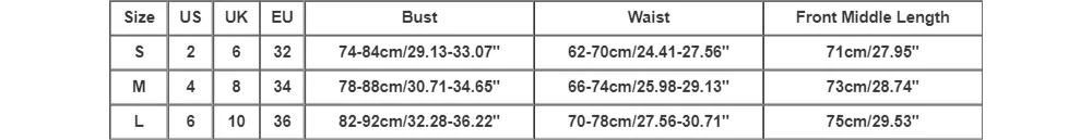 | Size:L | US:6 | UK:10 | EU:36 | Bust:82-92cm/32.28-36.22” | Waist:70-78cm/27.56-30.71” | Front Middle Length:75cm/29.53” |